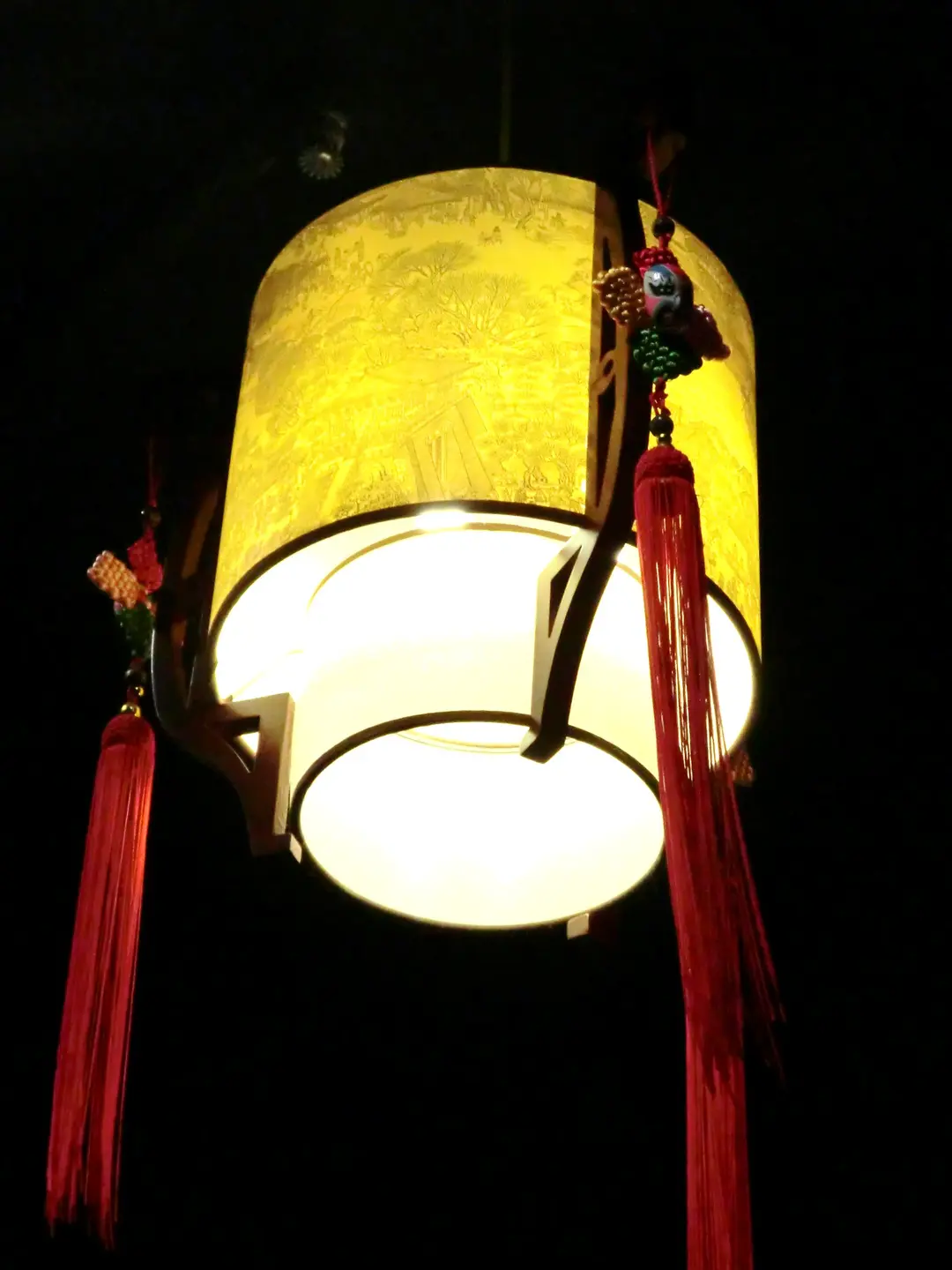 掛燈上有風景暗花圖案,三邊掛住如意結,結上有個面譜,相當特色!