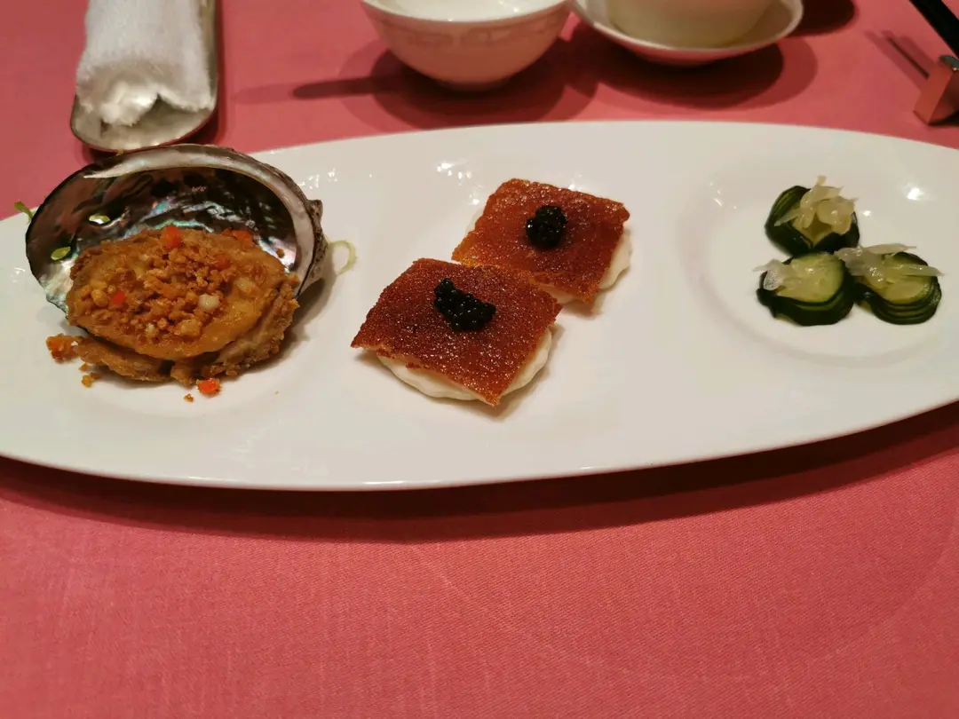 文華三弄 :蒜香鮑魚,黑魚子乳豬件,柚子醋小青瓜