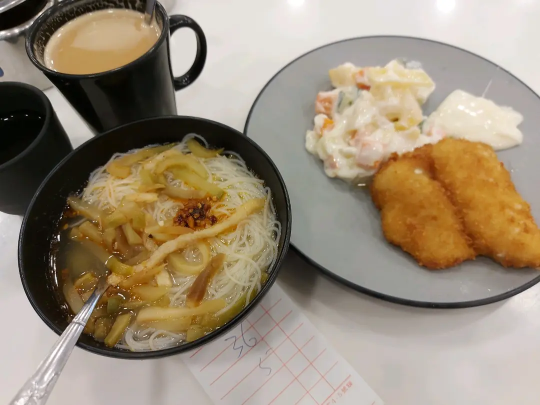 下午茶餐:吉列魚柳沙律加熱飲$36, 加多$5可選一碗粉麵,要炸菜肉絲米。