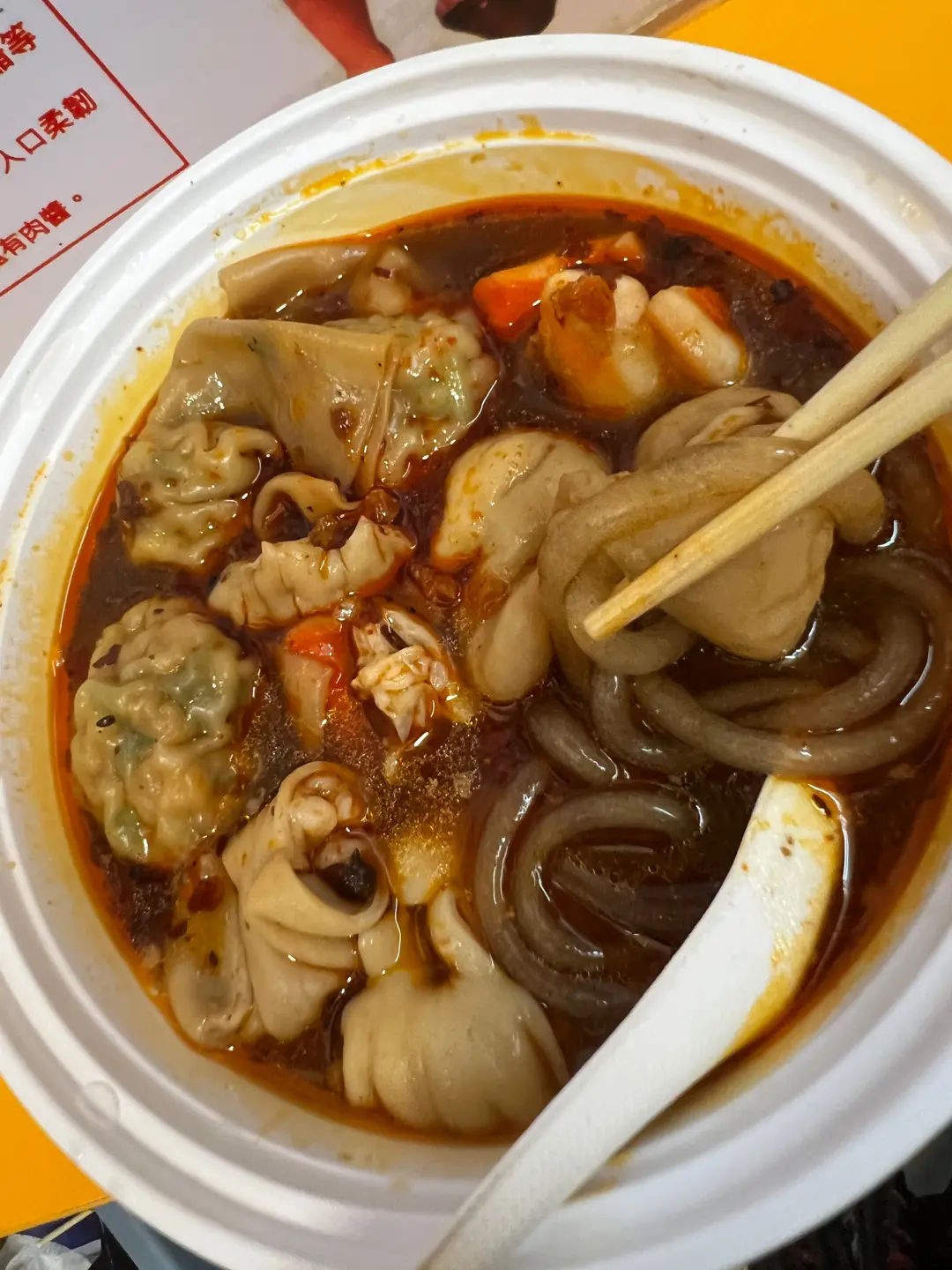 麻辣燙:韭菜餃、墨魚、豬腸、薯粉、麻辣湯