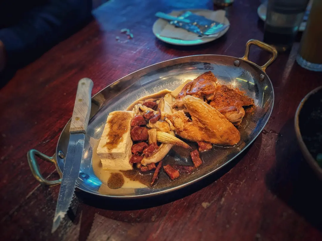 百里香牛油煎紐西蘭走地嫩雞肶肉 脆炸三黃雞全翼 白胡椒煮鹽鹵豆腐 手切本地臘腸燒汁