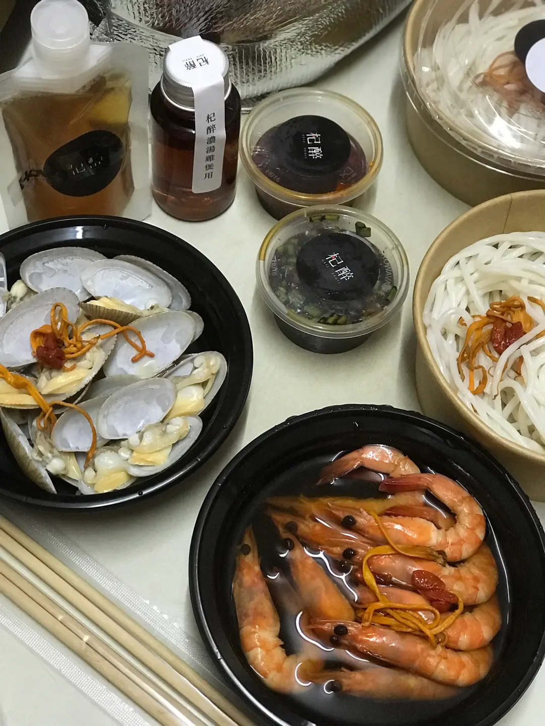 Drunken clams, drunken shrimps