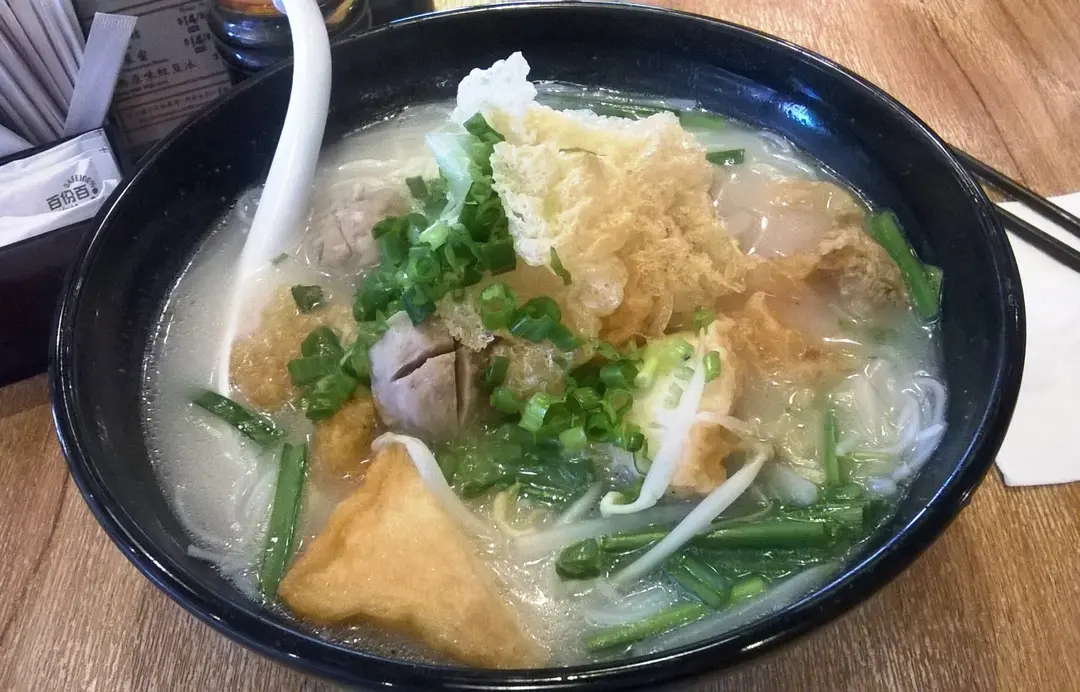 豬骨湯底雲南過橋米線配魚肉腐皮雲吞,炸片頭和貢丸