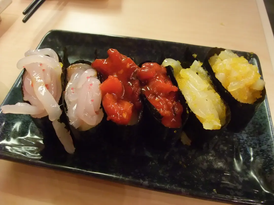 櫻花魷魚軍艦、芝麻八爪魚軍艦、黃金魷魚軍艦