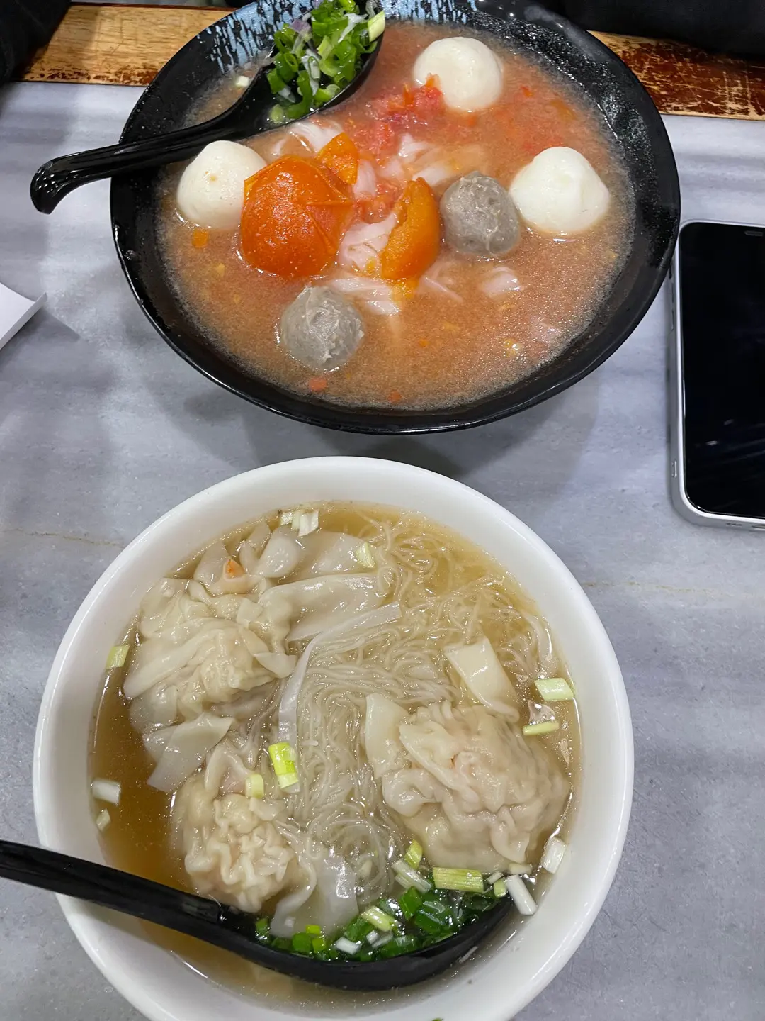 雙丸(3粒魚蛋+2粒牛丸)蕃茄湯河;清湯雲吞米粉