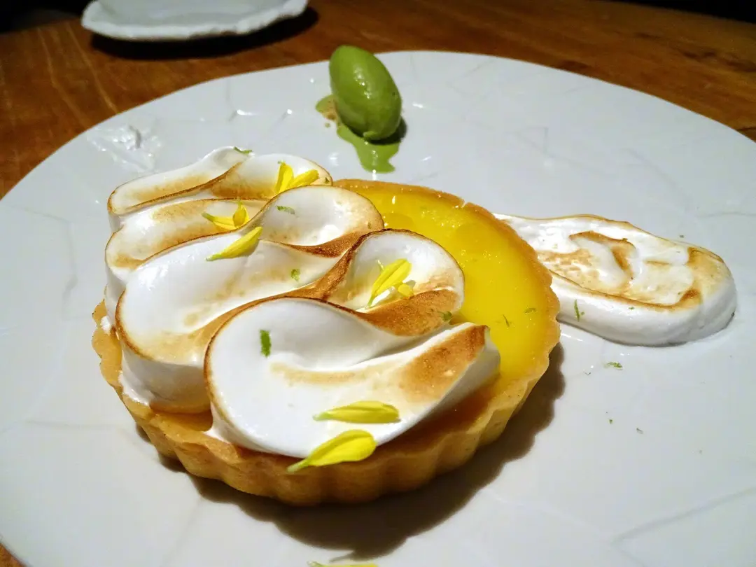 Yuzu tart, toasted meringue, green tea ice-cream