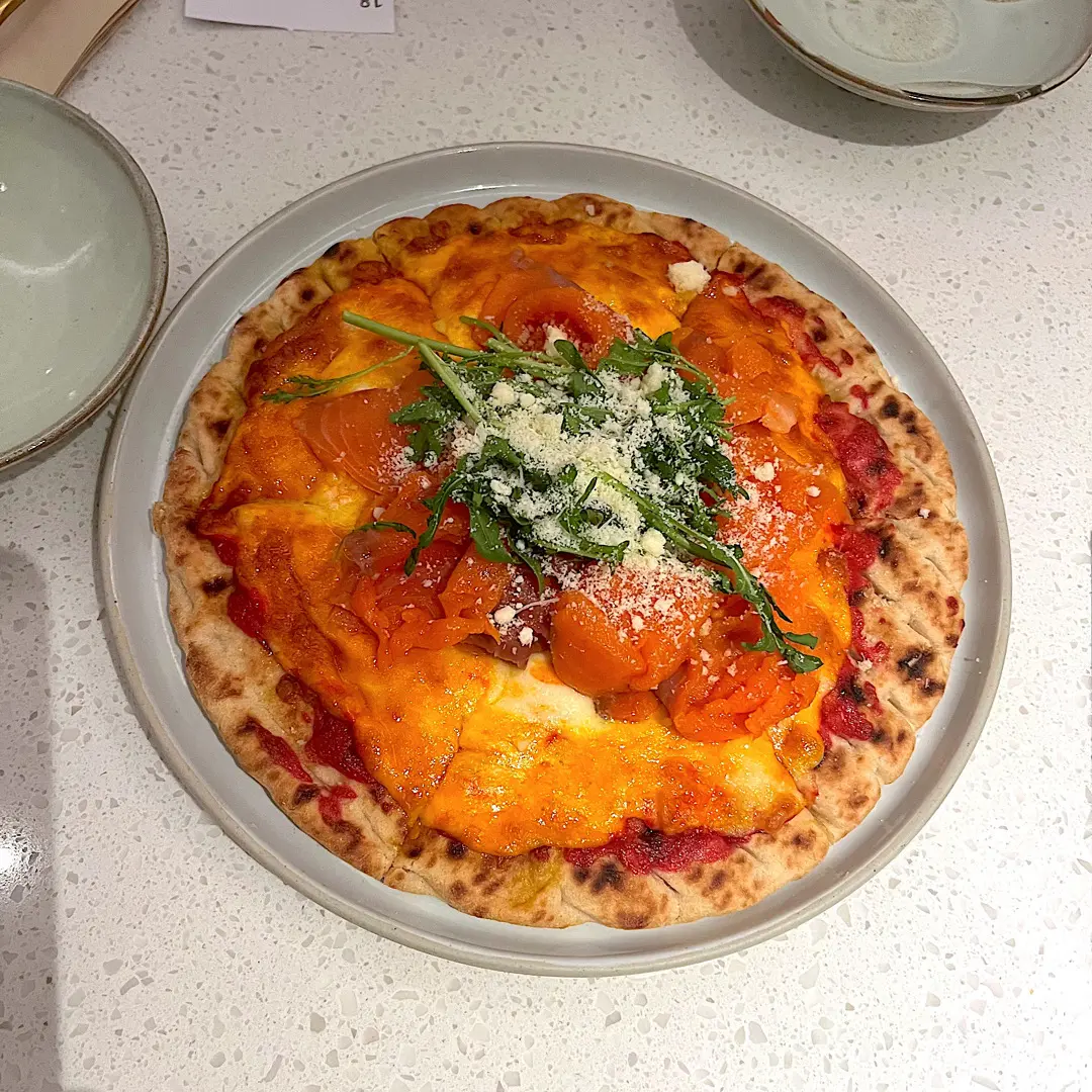 Pink salmon rocket pizza