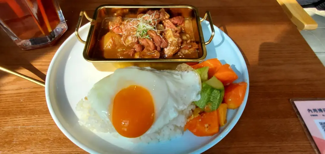黑咖哩牛肋肉飯配荷包蛋