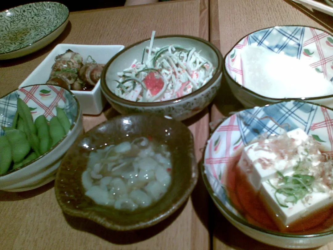 由左上開始:東風螺、蟹籽沙律、甜酸蘿蔔、枝豆、芥辣八爪魚、冷豆腐