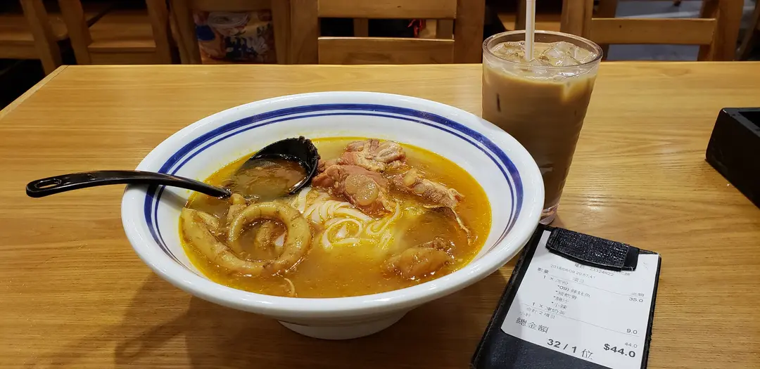 辣魷魚豬軟骨河粉+ 凍奶茶