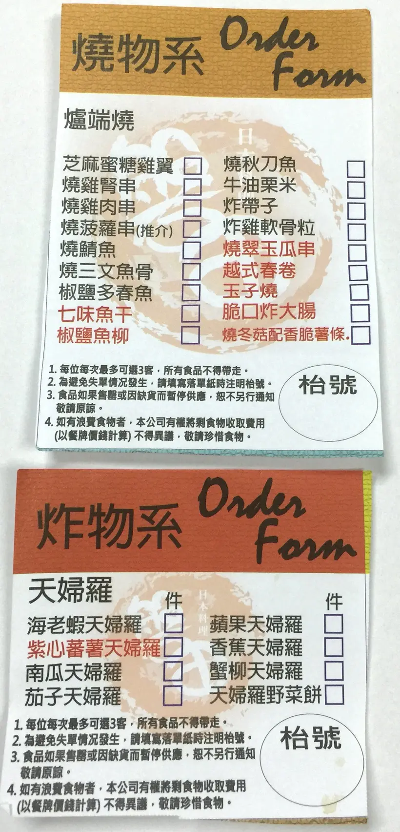 2小時任食放題Order 紙~燒物,及炸物