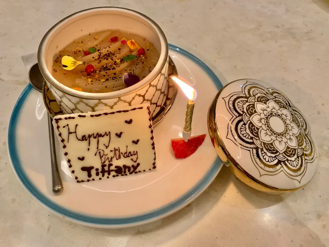 呢個甜品名叫「茶花」,上面係桃,下面係類似茶味嘅crème brûlée,好味同特別