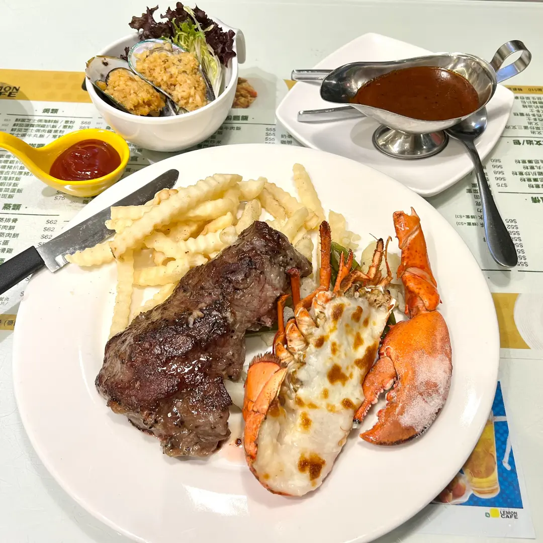 金銀蒜焗青口沙律及香草芝士焗龍蝦配牛柳