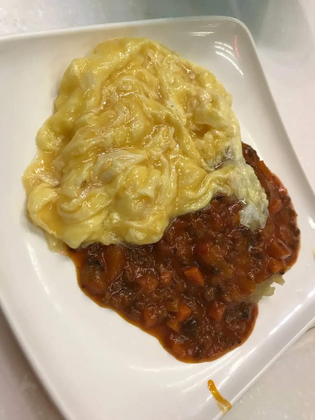 芝士牛肉濃茄湯通粉跟牛乳炒蛋肉醬焗薯泥