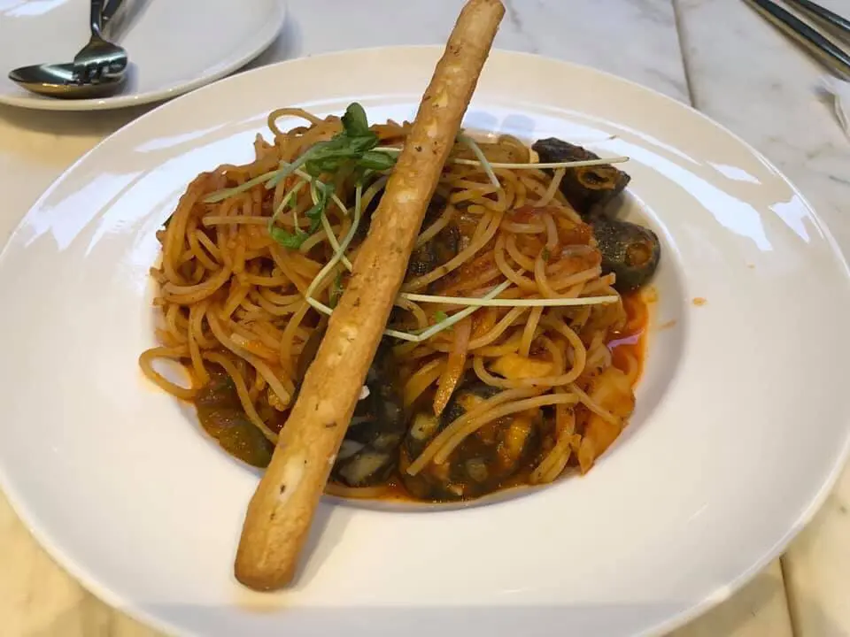 香辣鮮茄汁。墨魚腸意粉
