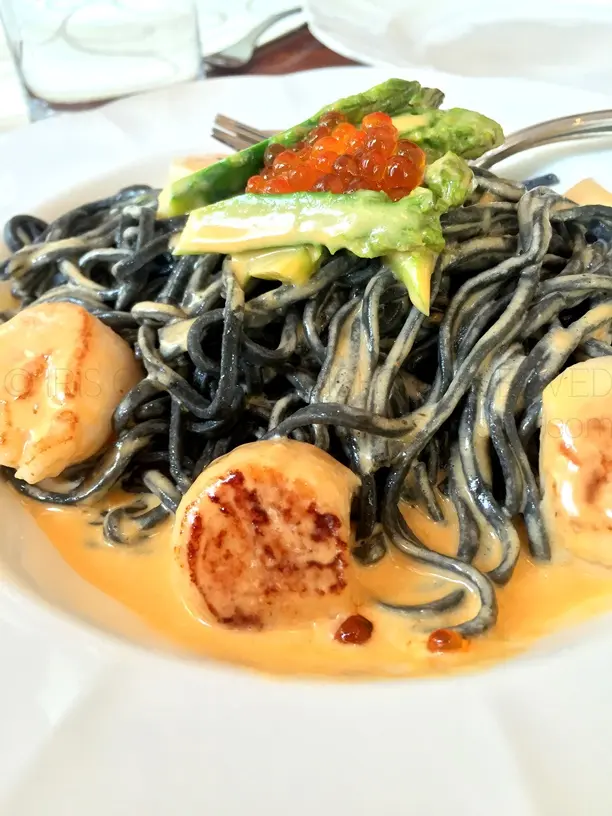 Squid-ink spaghetti with lobster sauce and pan-seared scallops