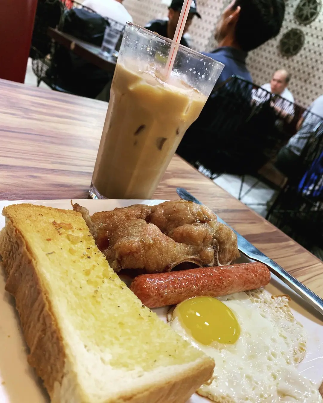 早餐豬排配腸仔太陽蛋在多個蒜蓉多士