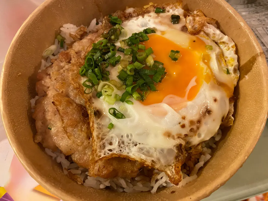 煎肉餅燶邊蛋飯$42+盒$2