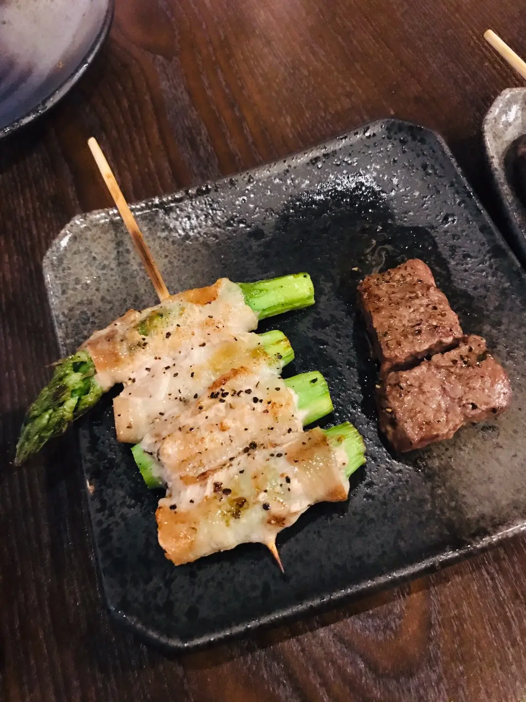 左邊係蘆荀豚肉卷,右邊係唔知咩牛肉