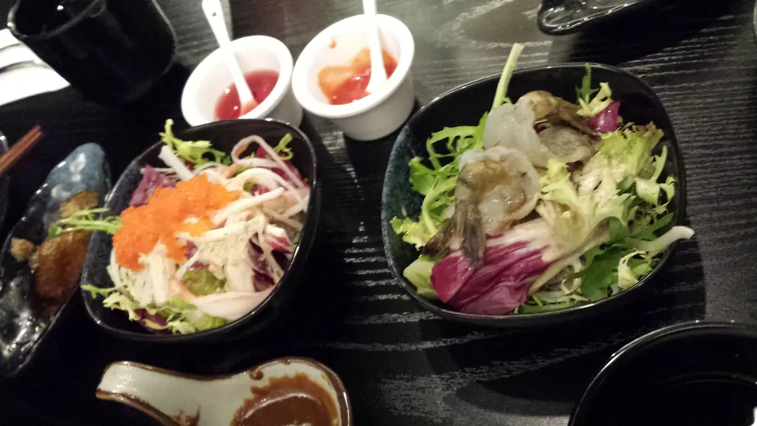 蟹籽沙律(左), 虎蝦刺身沙律(右)