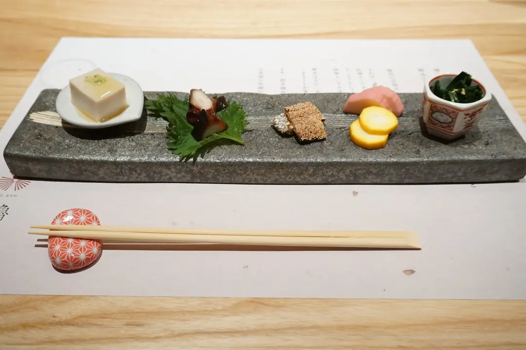 菠菜.漬黃脆玉瓜.梅醃長芋.芥籽太刀魚.汁煮八爪魚及芝麻豆腐。