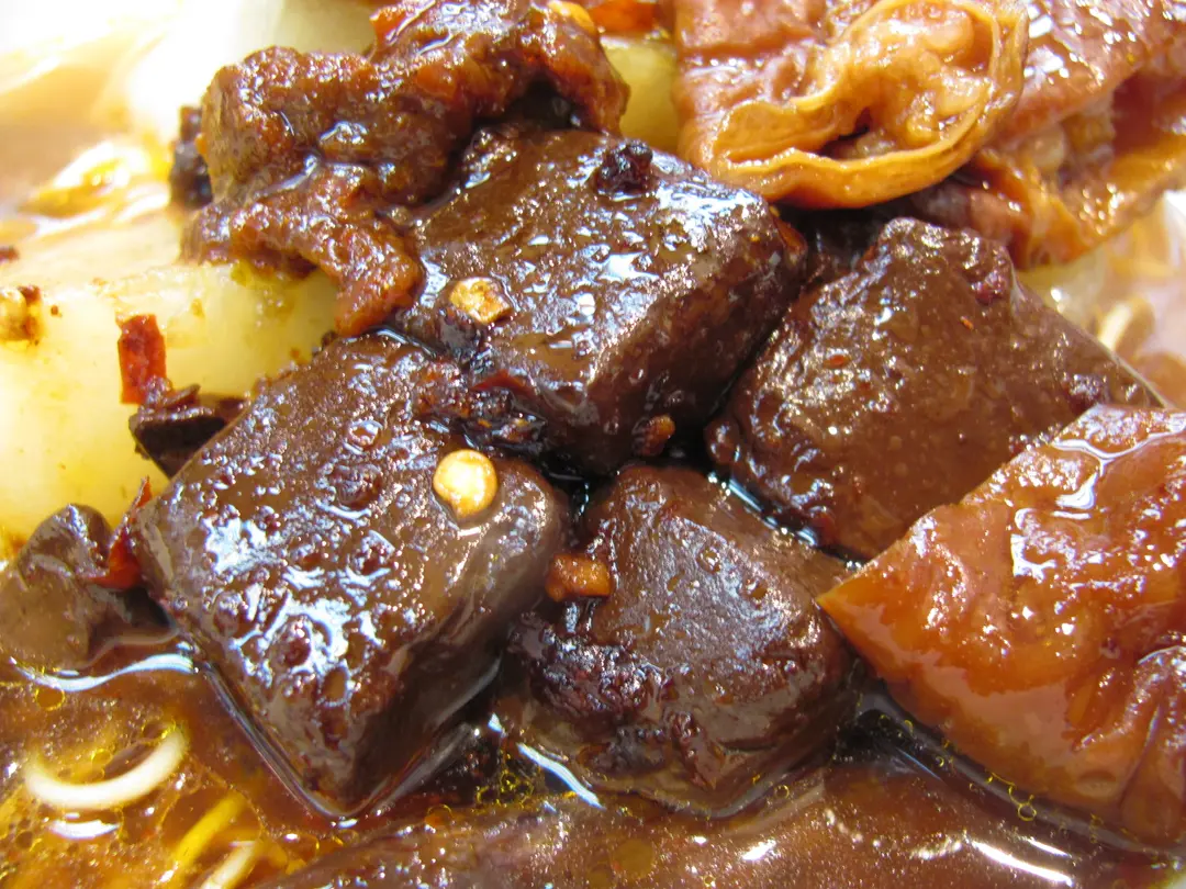 豬紅被鹵煮成深啡黑色,濃味美味