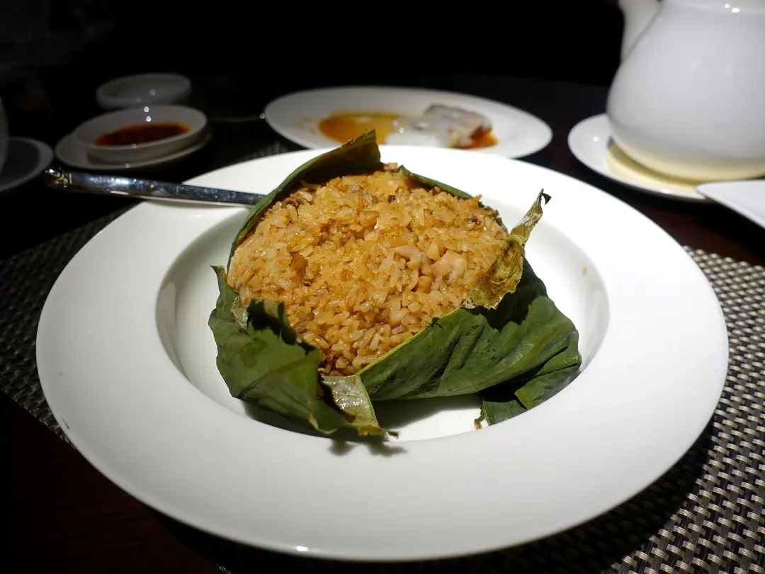 Fried rice with assorted meat and conpoy wrapped in lotus leaf