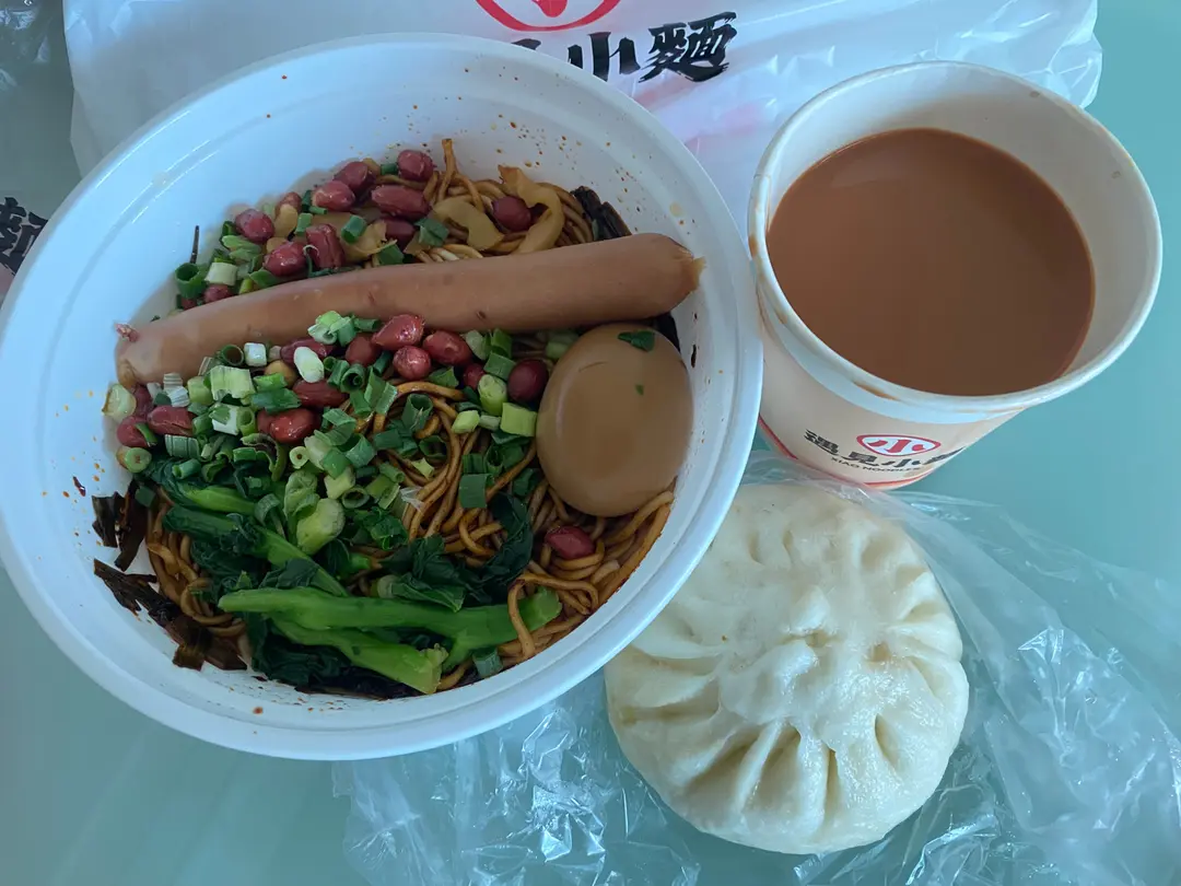 蔥油拌麵、鹵蛋、脆皮腸、奶茶(早餐$29)蒸包+$4