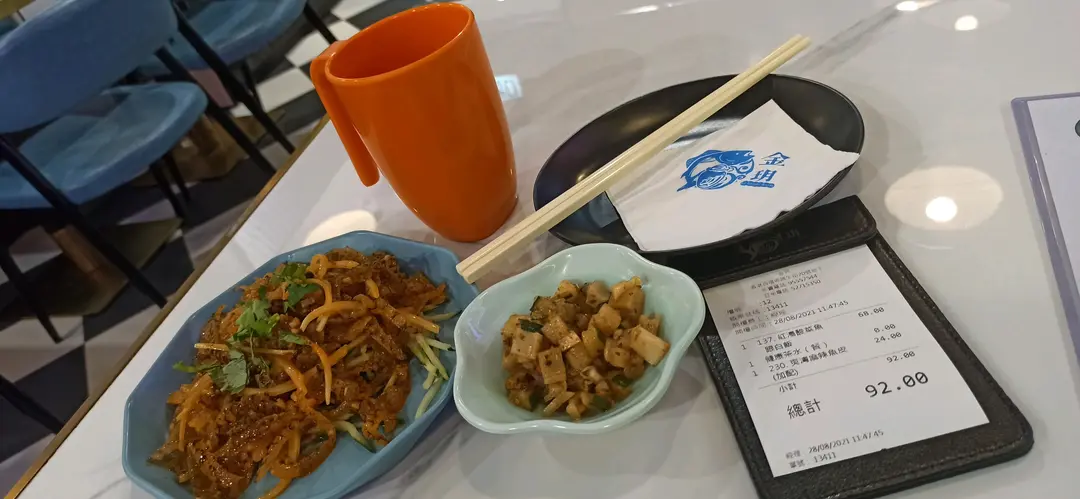 健康菜(蕎麥茶),小食(蓮藕青瓜粒),麻辣魚皮