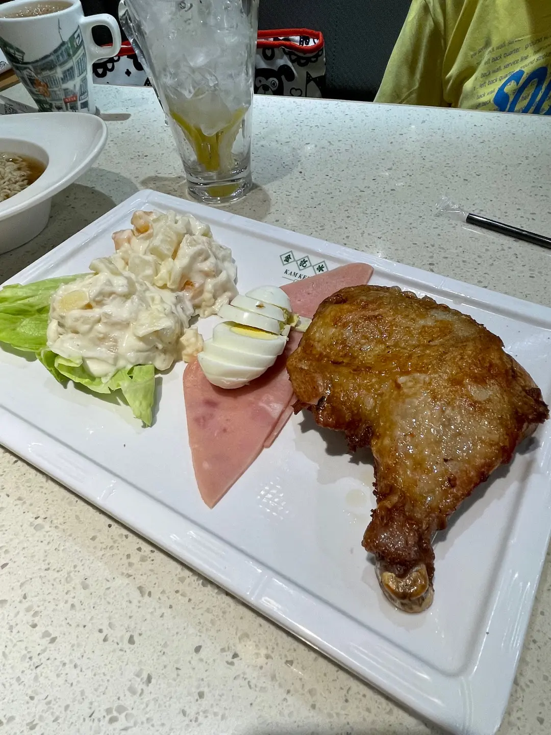 炸雞髀即食麵配火腿烚蛋沙律