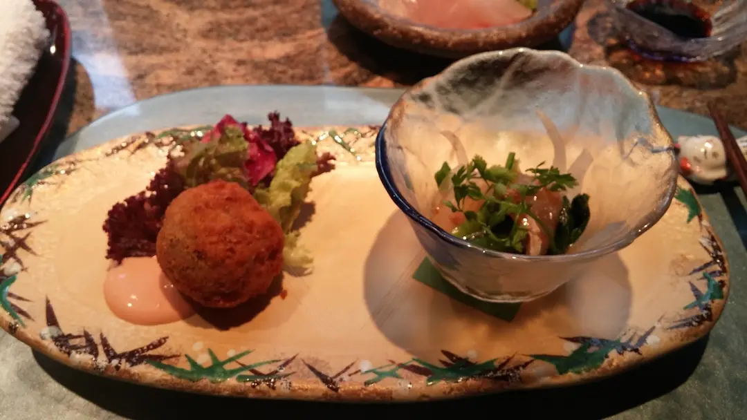 咖喱牛肉丸和赤鮭刺身
