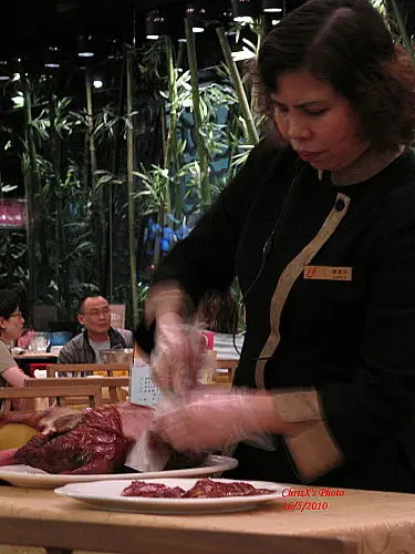 阿姐用狀似極純熟的手法將脆皮片出,不過每片鴨皮厚薄不一致.......繼續努力........