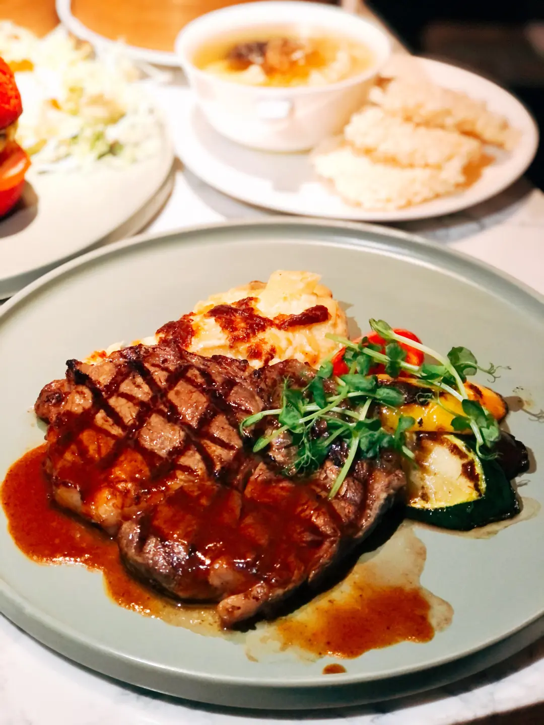 烤美國肉眼扒配時蔬及芝士忌廉焗薯,紅酒汁