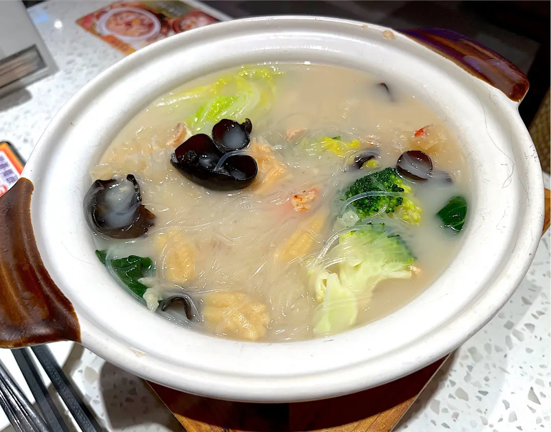Clear soup with seafood, assorted vegetables and vermicelli in hot pot