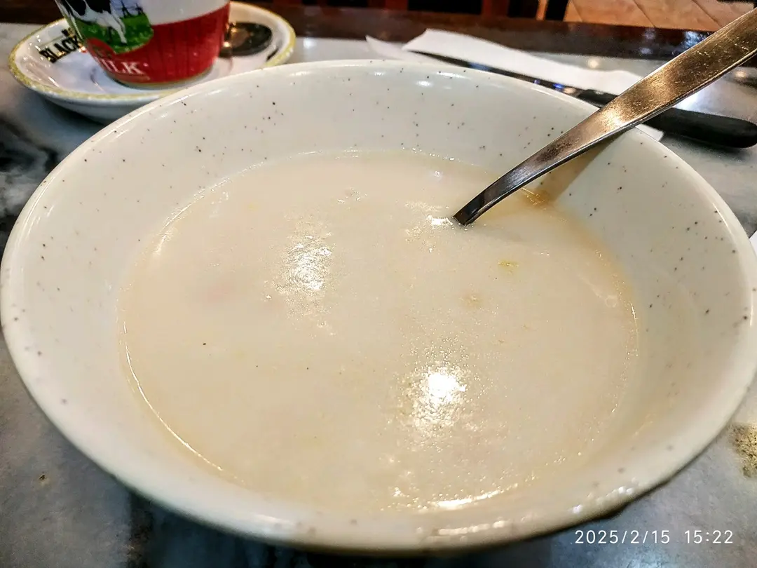 鐵板洋蔥巴西豬扒意粉配忌廉湯跟熱奶茶