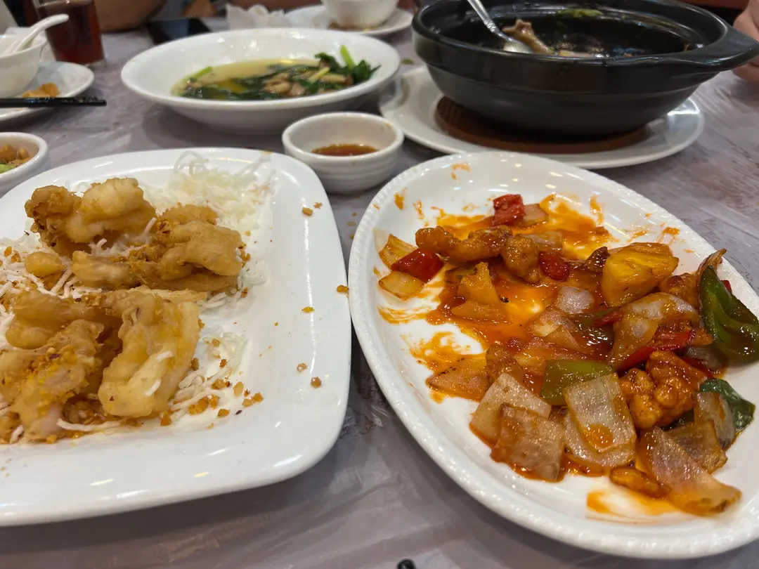 椒鹽魷魚、咕嚕肉、豆腐煲、上湯豆苗