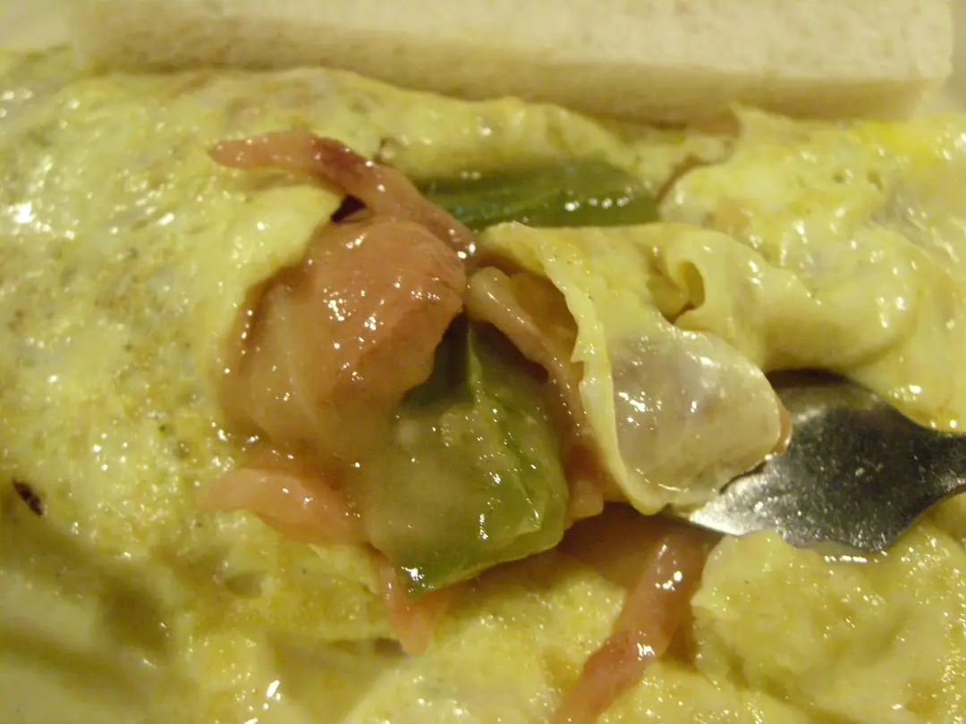 餡料有腸仔、火腿、青椒及磨菇外,也有點蛋汁