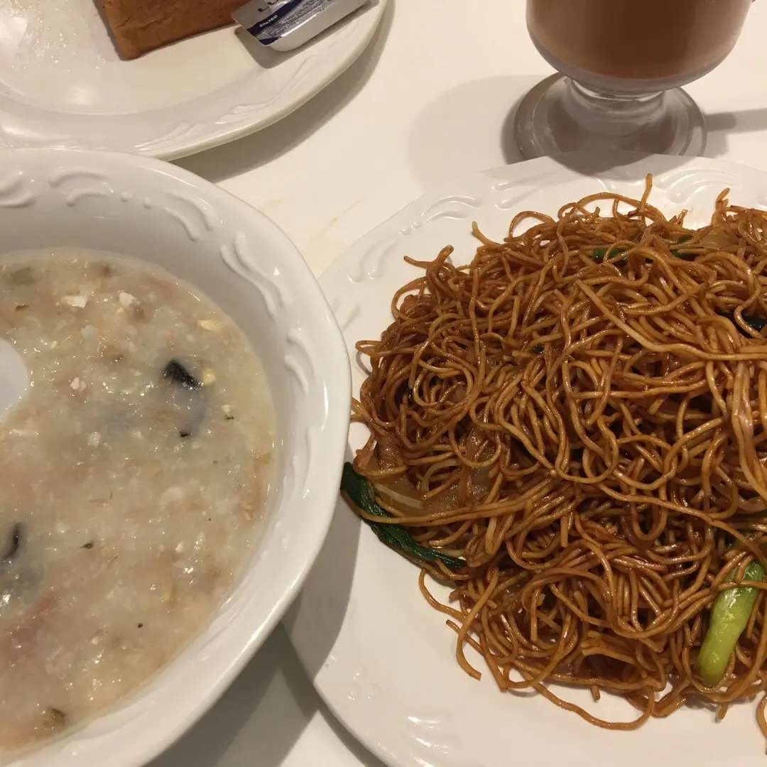 早餐:皮蛋瘦肉粥+炒麫+茶走