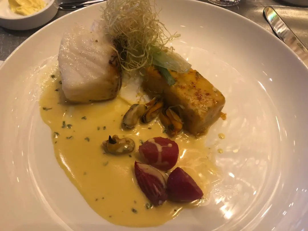 煎白鱈魚柳、薯片焗千層、忌廉大蒜、藏紅花忌廉汁