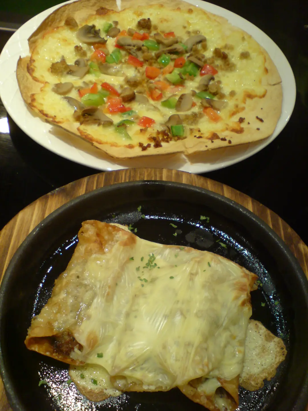 香蒜風味腸肉野菌 pizza ($68) & 鐵板芝士雞軟骨餃子 ($36)