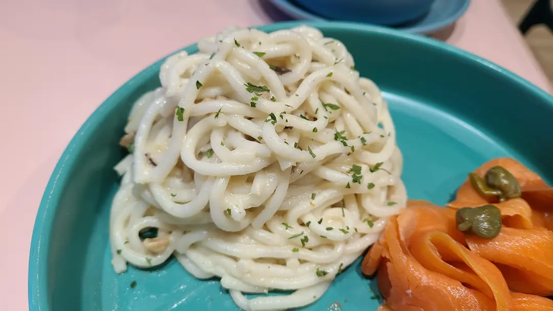 忌廉蘑菇煙三文魚魚麵撈