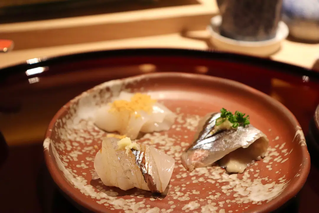 Cuttlefish with karasumi イカとカラスミ・Japanese halfbeak サヨリ・Pacific saury 秋刀魚