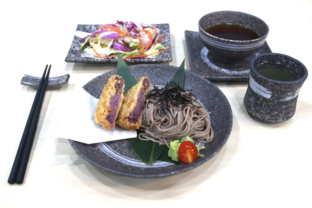 紫芋甘栗餅配涼拌蕎麥麵