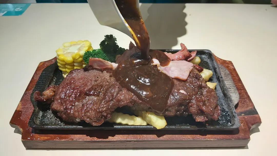鐵板西冷牛扒跟薯菜黑椒汁