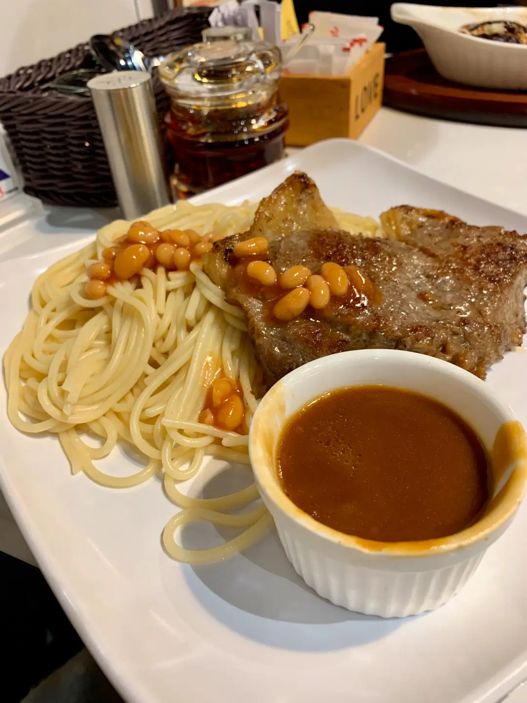 燒汁黄焗豆西冷扒意粉