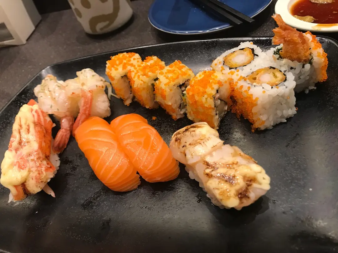 珍寶皇帝蟹柳,三文魚,炙燒牛油赤海蝦,加州小卷,炸蝦卷,炙燒帆立貝