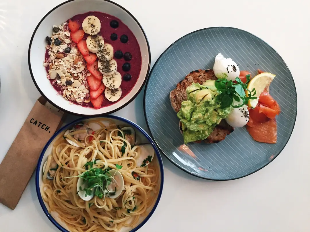 smoothie bowl (138), linguine vongole (168), smashed avocado + smoked salmon (138+35)