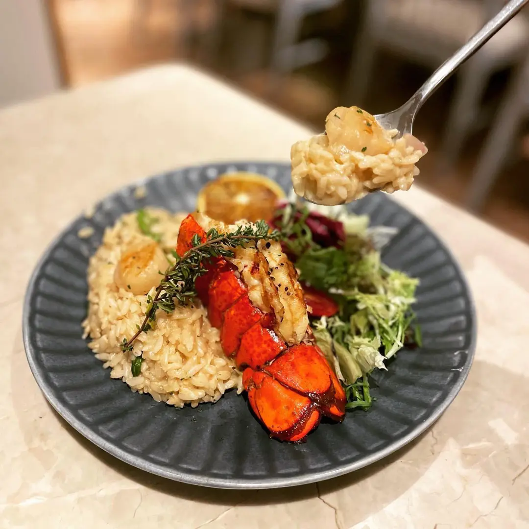 鹽燒龍蝦尾拼帶子配龍蝦汁