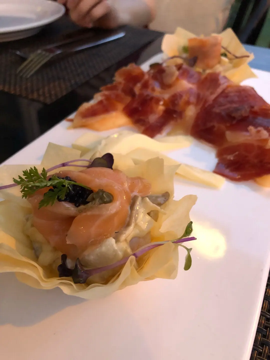 三文魚墨魚子酥皮塔,48個月風乾火腿
