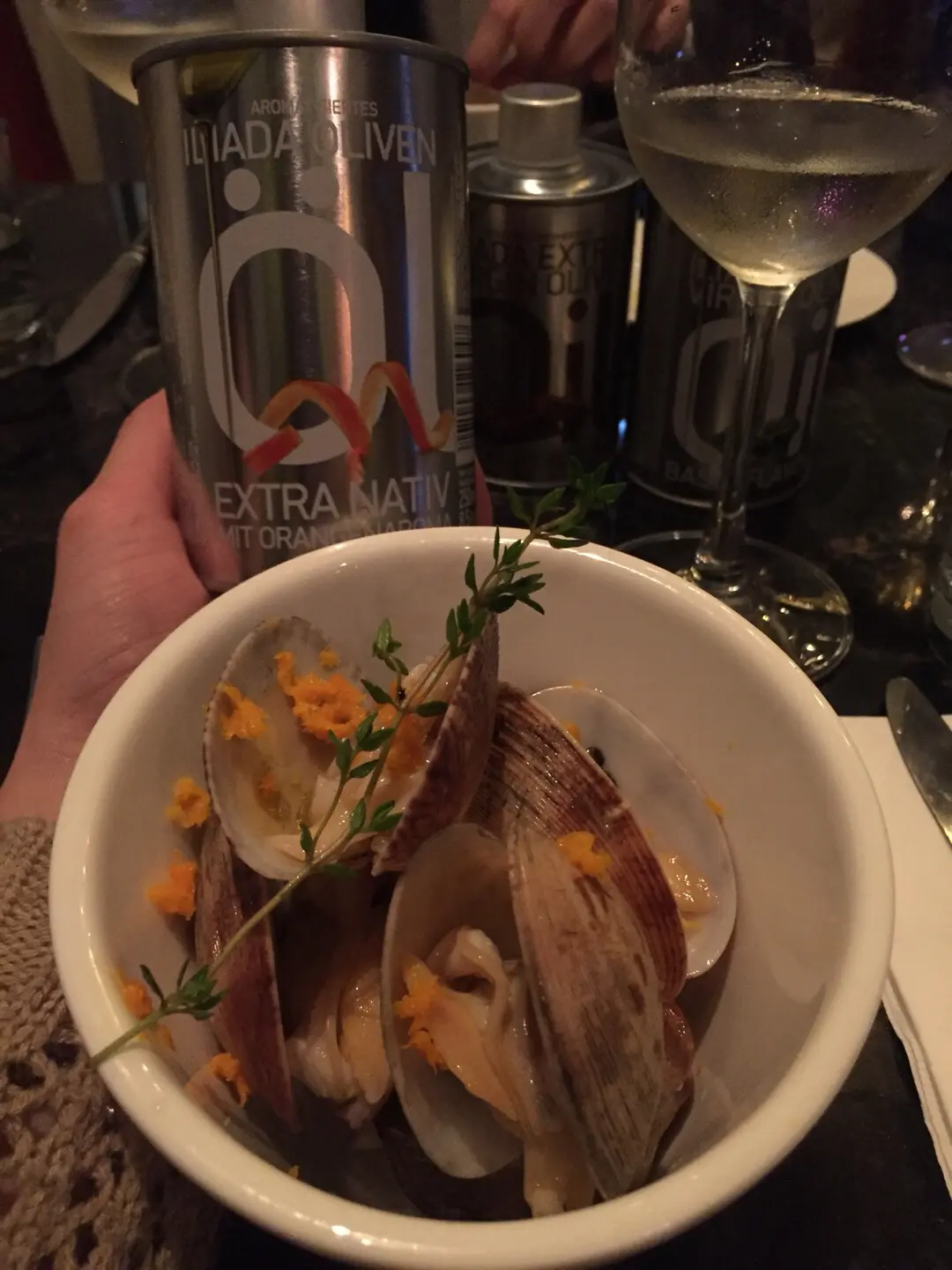 Poached clam in chill served with chives,champagne jelly,pomegranate&orange olive oil香蔥花蛤配橙味橄欖油伴石榴香檳果凍